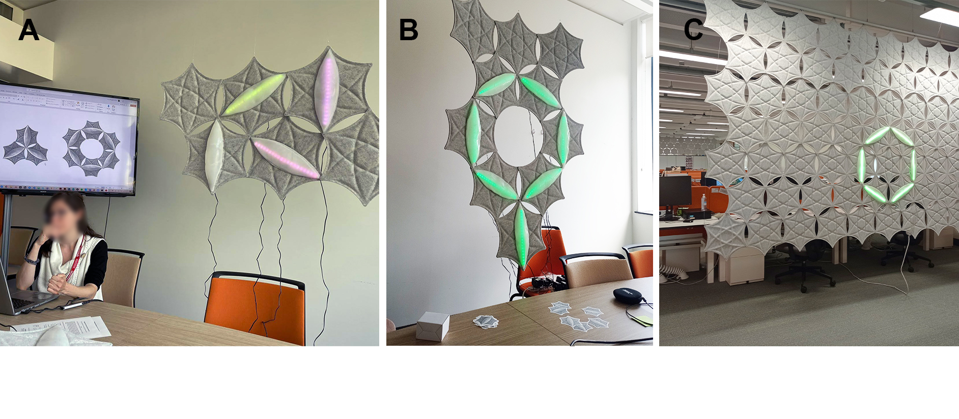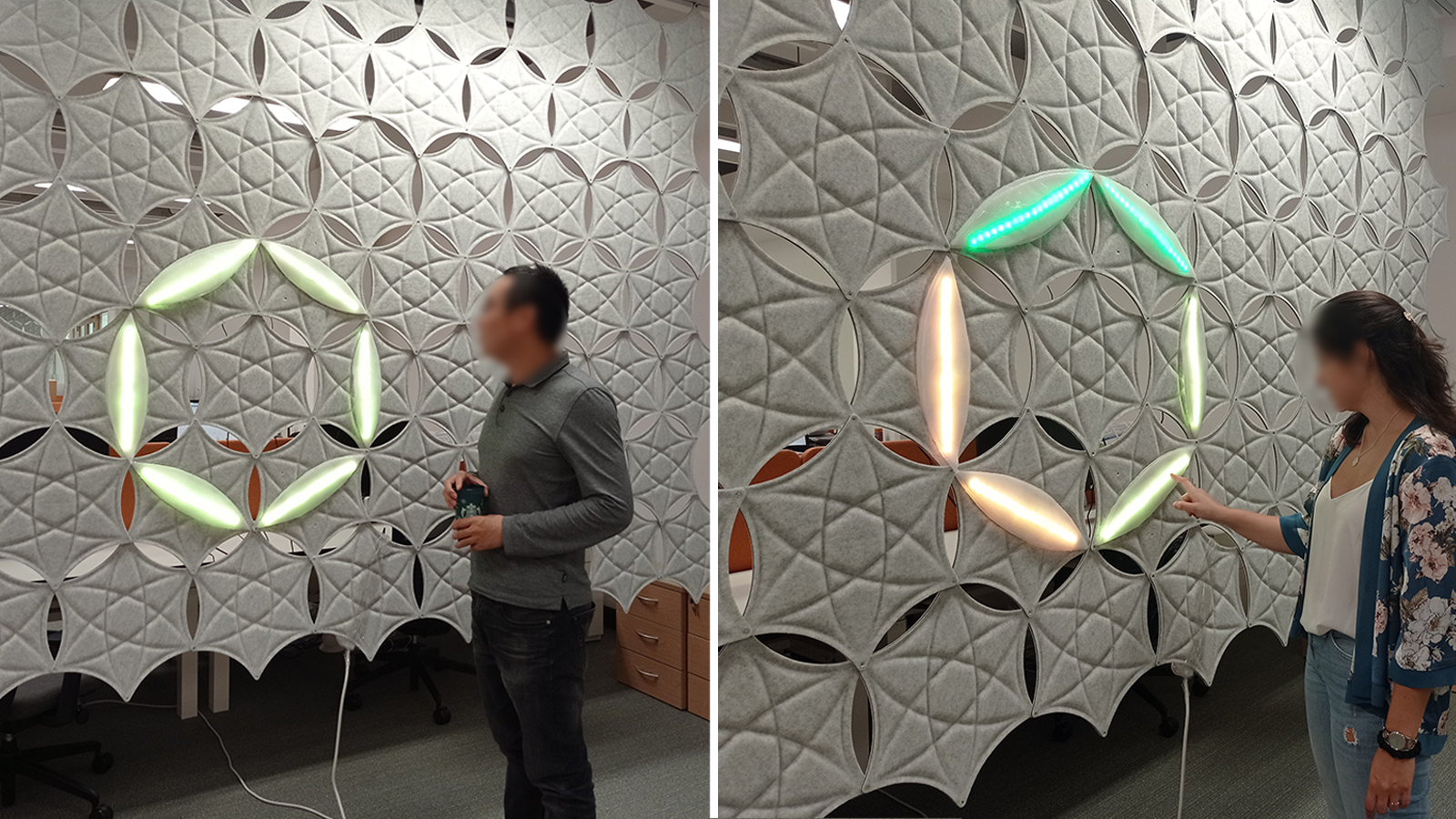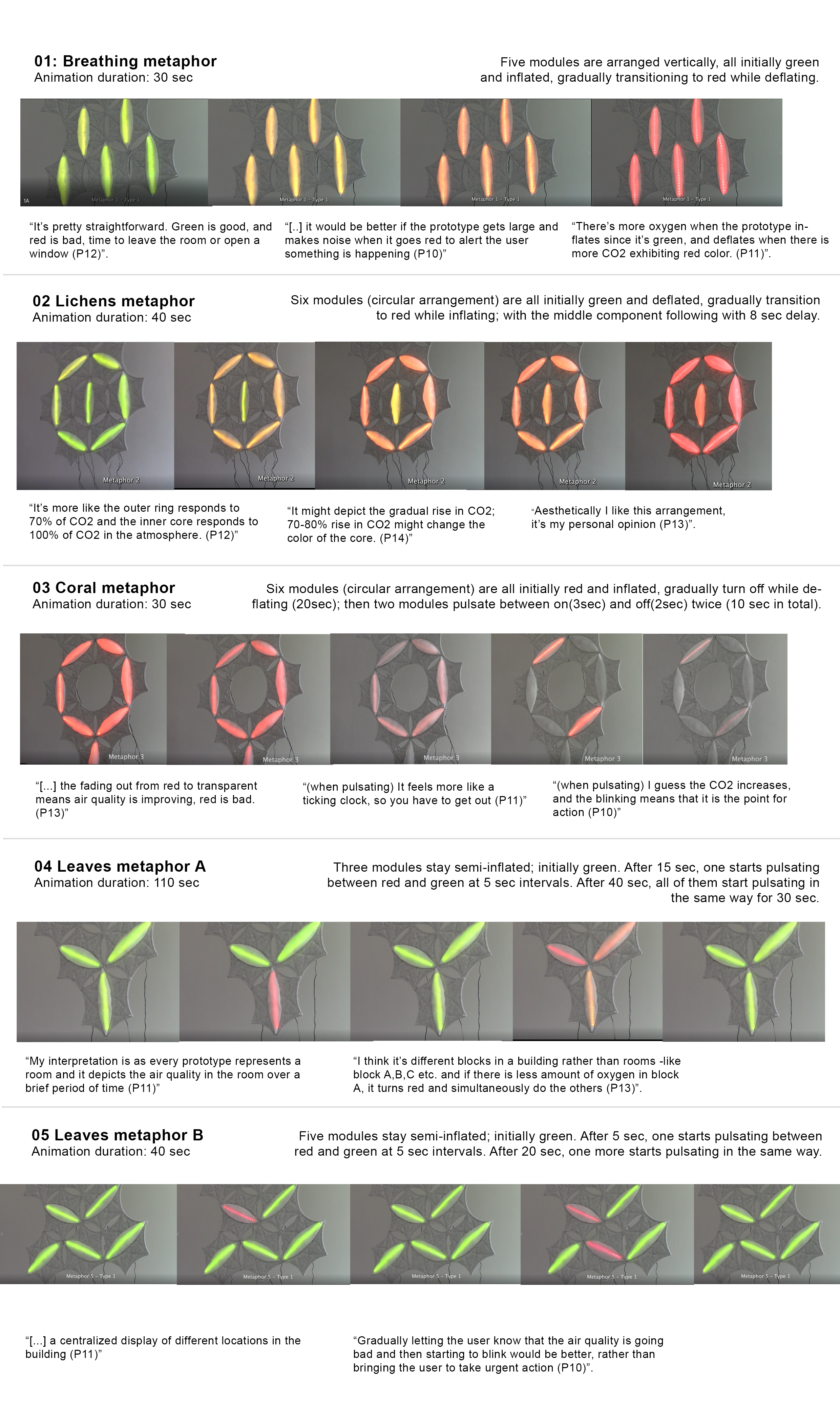 Beyond implementation, I deployed and evaluated ActuAir with the building occupants of a smart building. To-date, there are limited studies evaluating large scale soft robotic interventions in the context of communicating CO2 data in the workplace. Responding to this research gap, three prototype-led studies were conducted with 21 occupants of a smart office building over June-August 2022, evaluating occupants’ experiences of a large shape- and color-changing display responding to AQ data. Different arrangements and customizations of the modules (inspired by biomimetic metaphors) were presented to participants; which were then asked to reflect on what the display communicates to them, how do they interpret the feedback, and what spatial associations do they see. A thematic analysis resulted in design implications for improving shape- and color-changing large scale soft robotic displays for communicating CO2 data; linking biomimicry and spatial cognition to feedback interpretation.