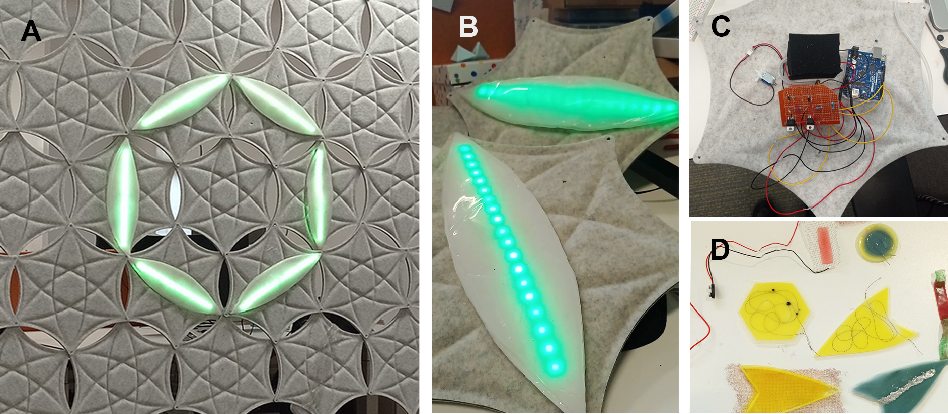 Above: A. The display’s modules in the default set up in a circular arrangement. Green is an indication of good air quality. The changes in CO2 are depicted with inflation/deflation and color change (green-yellow-red scale). The combination of using light color and inflation as parameters to communicate CO2 levels were subject to user testing. B. Testing LED color diffuse, in an inflated and a deflated module. C. Electronics at the back of each module. D. Material exploration.