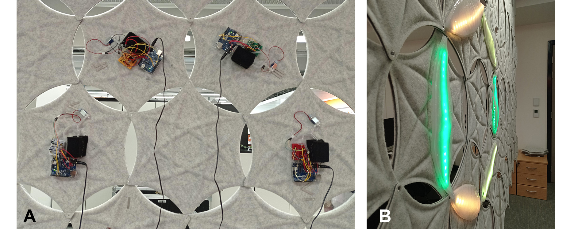 The project physicalizes changes in CO2 levels through shape and color-changing silicon and fabric modules, with integrated LED strips. These modules can be put together and be re-arranged by the building users to form soft barriers in the workplace. Each module operates with a wireless Arduino connected to a local server built on Raspberry Pi. The server is fetching AQ data (CO2, temperature, humidity) from the building’s open API and wirelessly communicates with the Arduinos which control the LED’s intensity and color (green-yellow-red gradient), and the air-pumps and valves for each module e.g. the amount of air pumped in and out, and the time they stay inflated or pulsing. All hardware (Arduinos, air -pumps and valves) are integrated in each module, enabling them to act as stand-alone and in coordination with other modules.